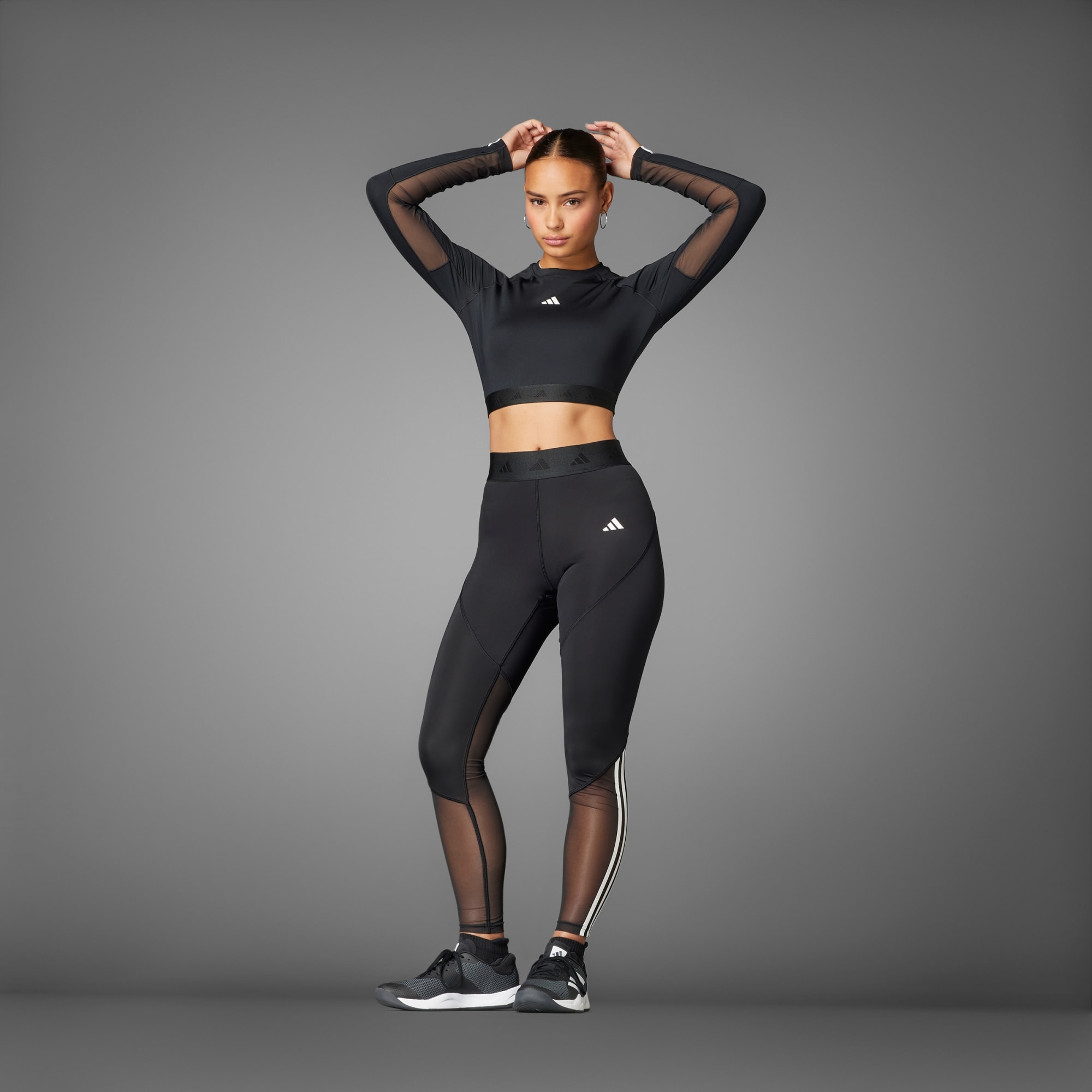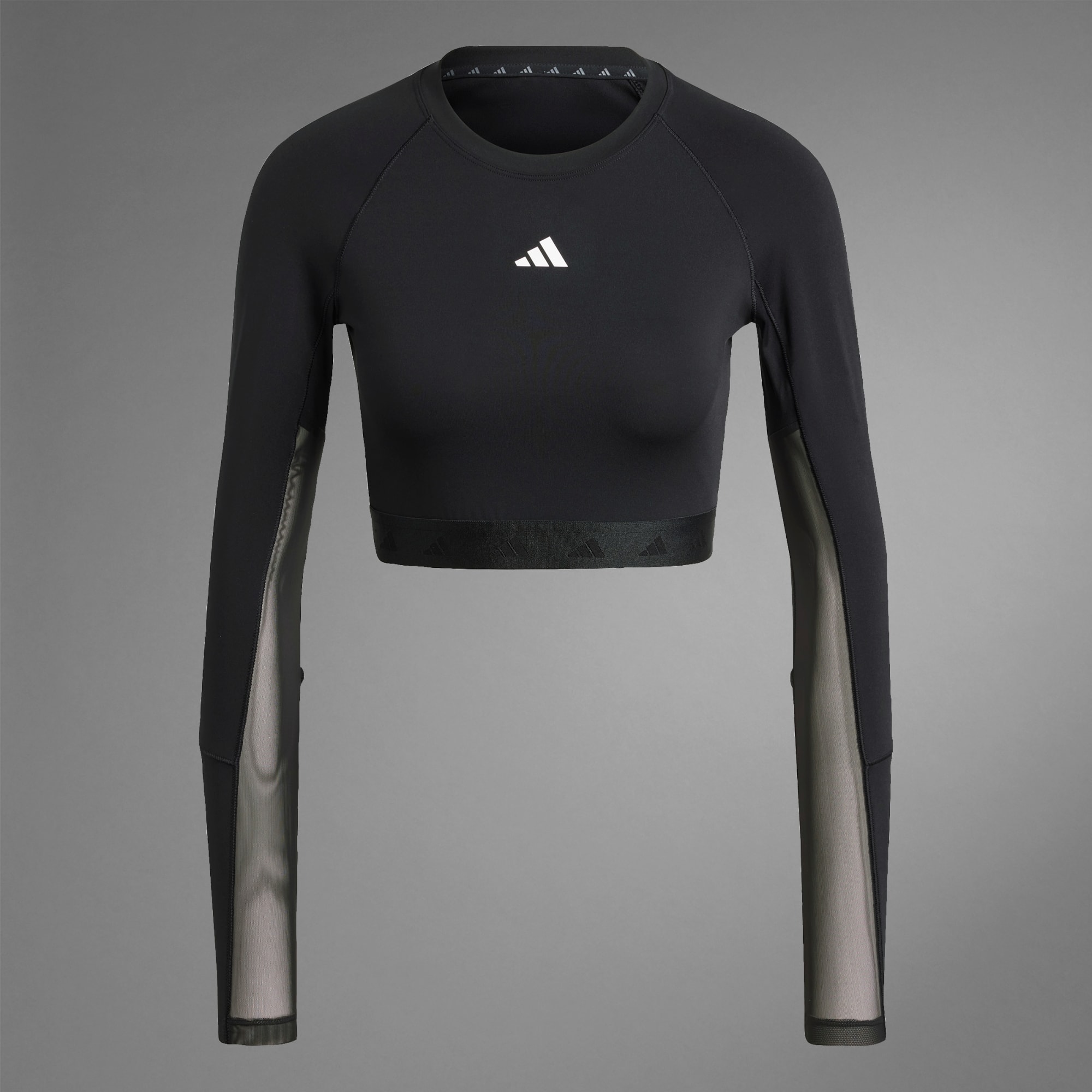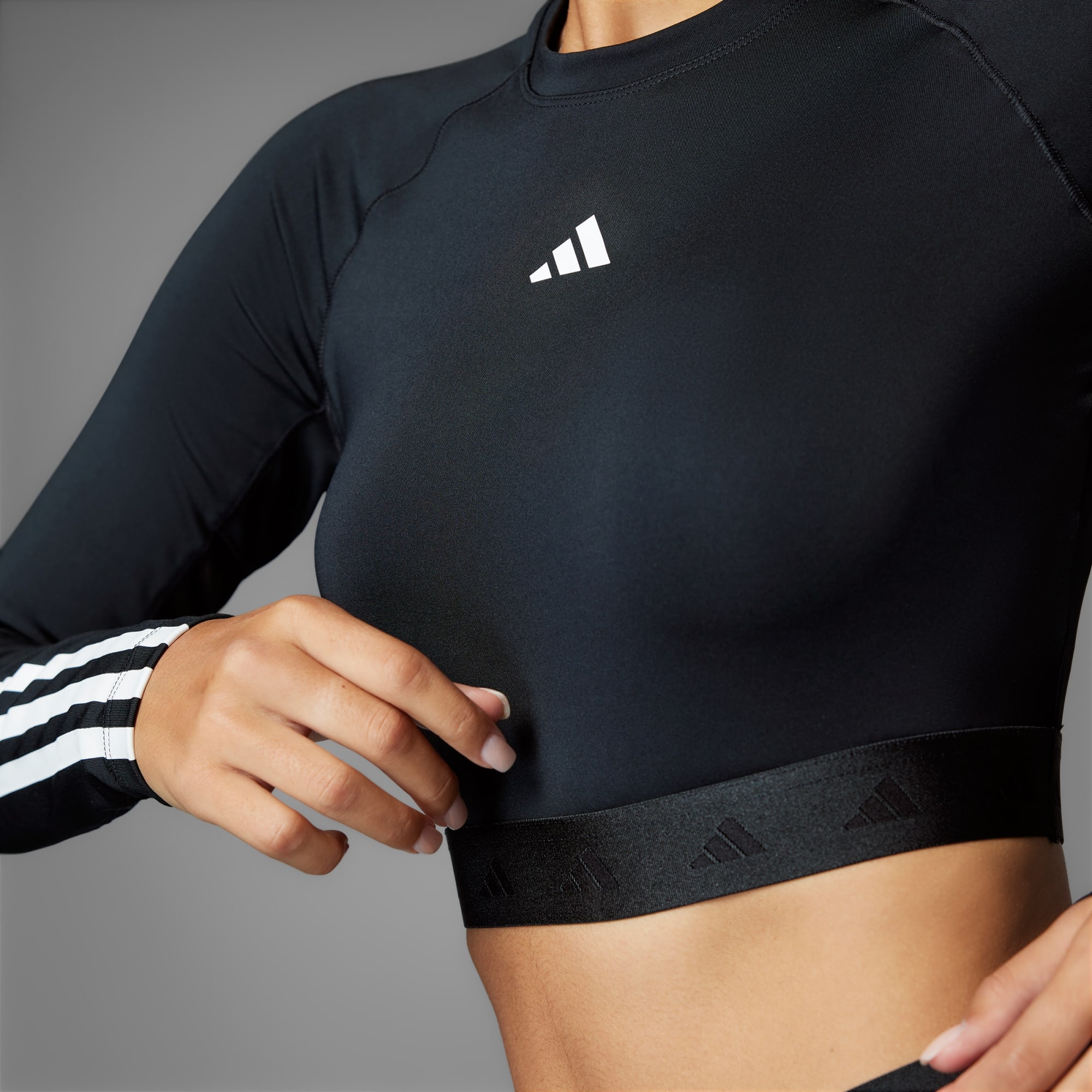 Sporty, but make it cute. That's the philosophy behind this adidas cropped tee. Feel confident pushing through high intensity intervals thanks to moisture-absorbing AEROREADY and mesh panels that add targeted breathability. Long sleeves that show off 3-Stripes give it athletic cred, while the cropped length pairs perfectly with your favourite leggings or shorts. Designed for hybrid training and versatile performance.