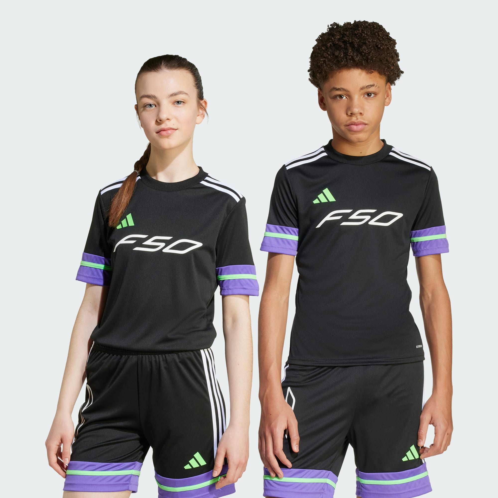 Fliege über das Feld in einem Fußballtrikot für Kinder und Teens, das zur Königsklasse der adidas Speed Boots passt. Dieses leichte Shirt hält dich dank seines weichen Materials und des feuchtigkeitsregulierenden AEROREADY frisch, damit du für jeden Zickzacklauf und jeden blitzschnellen Sprint gewappnet bis. Eine große F50-Grafik auf der Brust zeigt, dass du zum Laufen geboren wurdest.