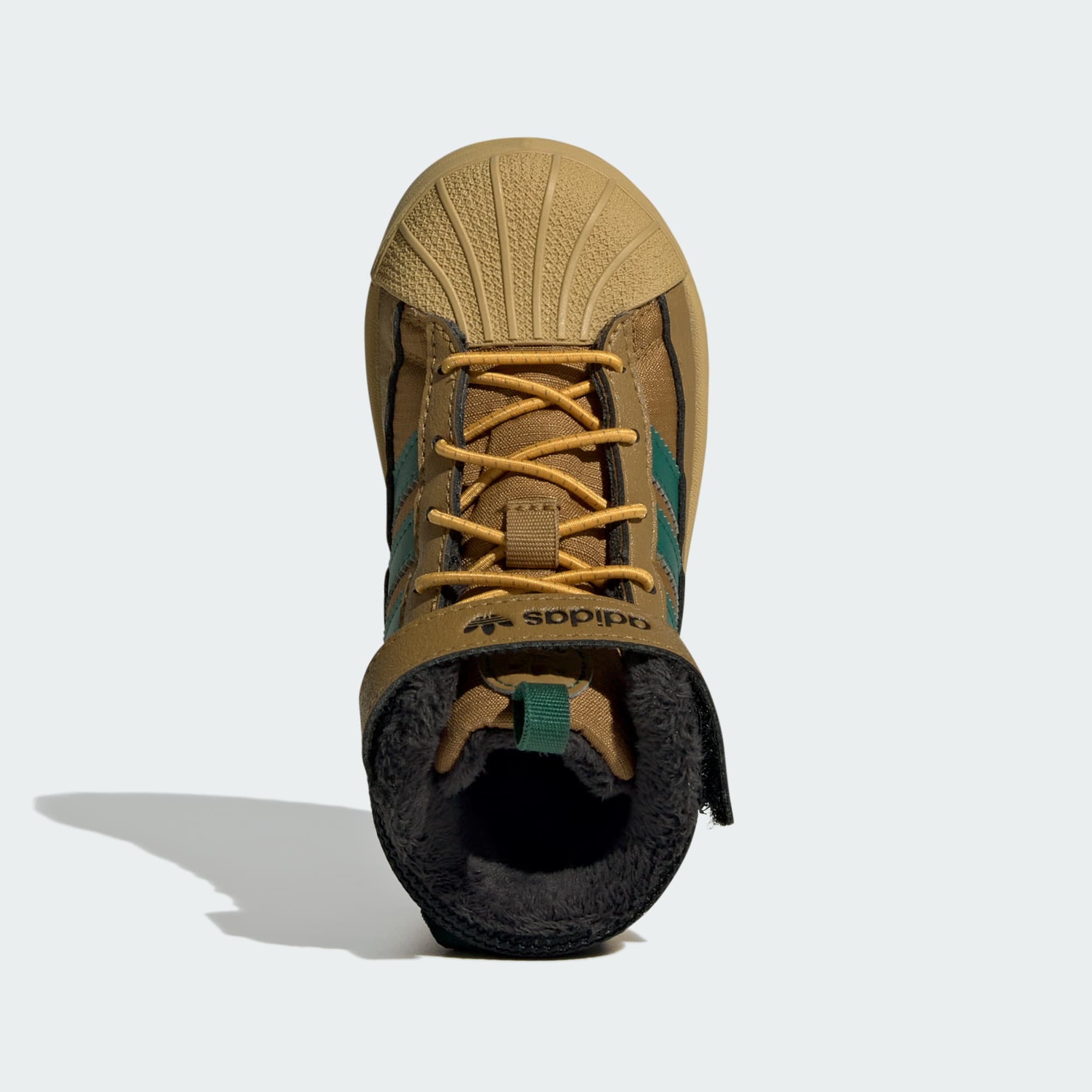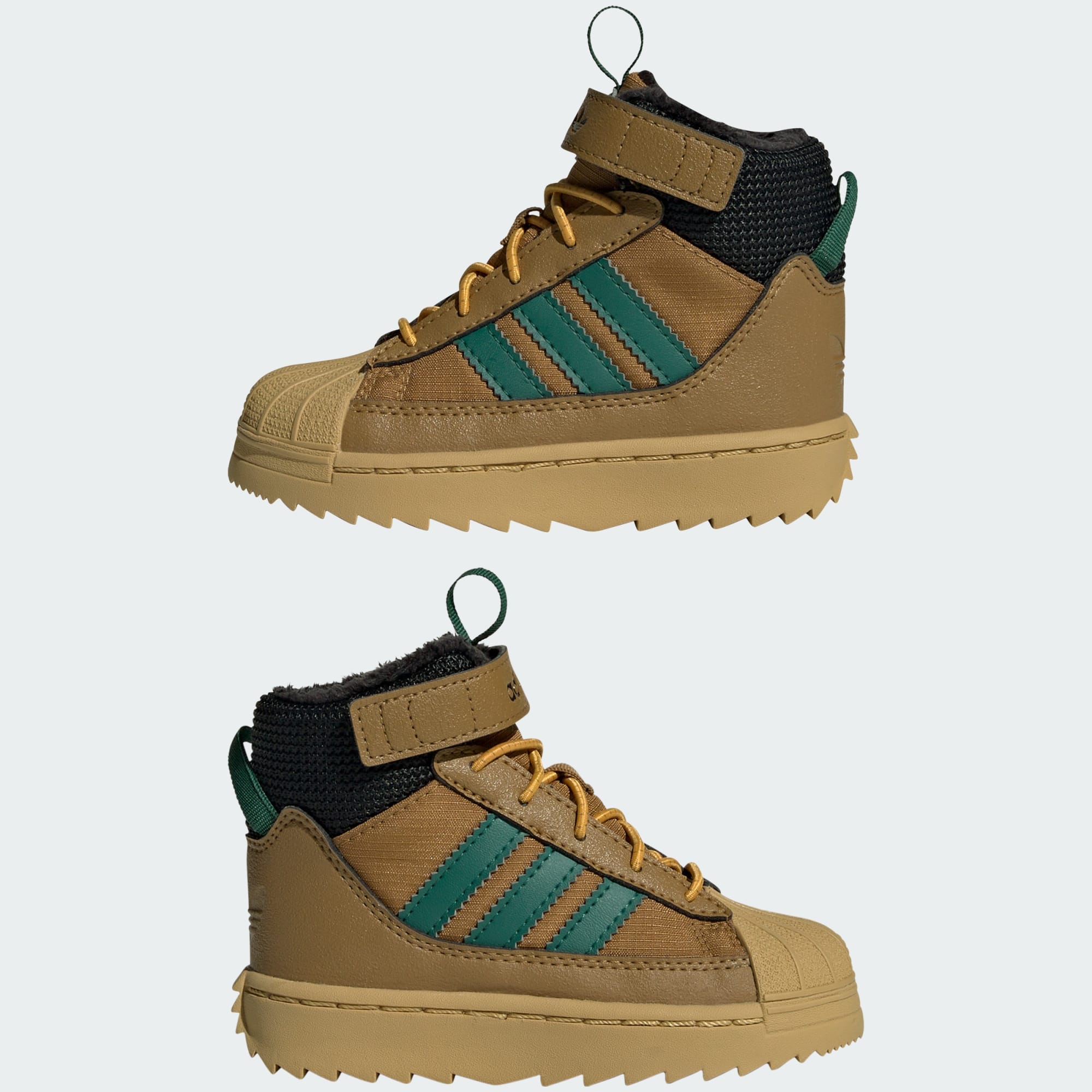 Dieser adidas Superstar Winter Trek Schuh für Babys und Kleinkinder bietet kleinen Abenteurer_innen im Winter ikonischen Style und optimalen Schutz. Der Innenschuh hält Regen und Schnee ab, während die robuste Außensohle guten Grip auf rutschigem Untergrund garantiert. Elastische Schnürsenkel und ein Riemen am Schaft erleichtern das An- und Ausziehen mit kalten Fingern. Die Wildleder-Overlays auf dem Nylon-Obermaterial greifen den sportlichen Look des Originals auf und machen ihn wintertauglich.